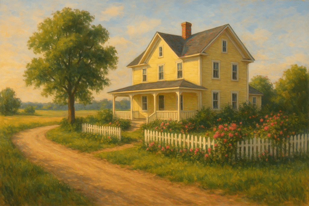 The house had wide verandas that wrapped around it, wooden columns that had long since lost their shine, and windows that opened to fields stretching far into golden afternoons. A white picket fence framed the front, though the paint peeled in places, giving it the look of something trying to remain youthful while gracefully embracing age.